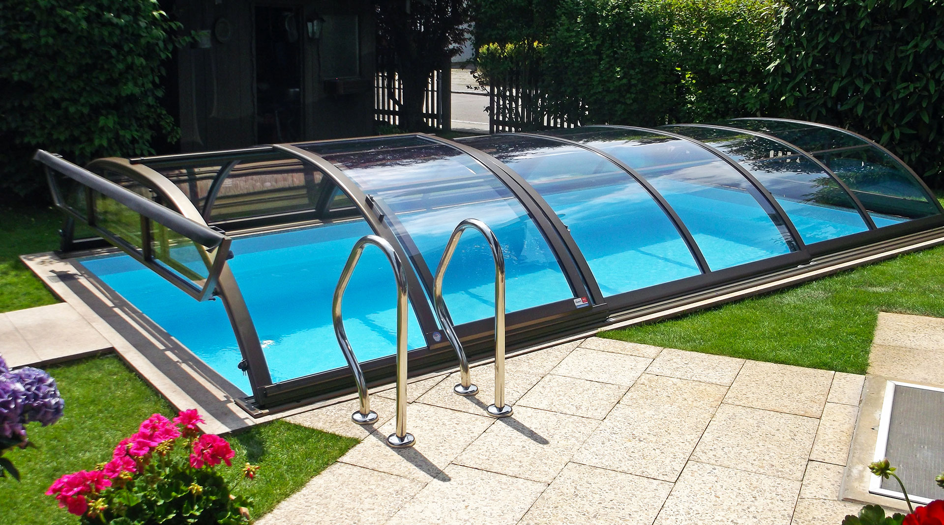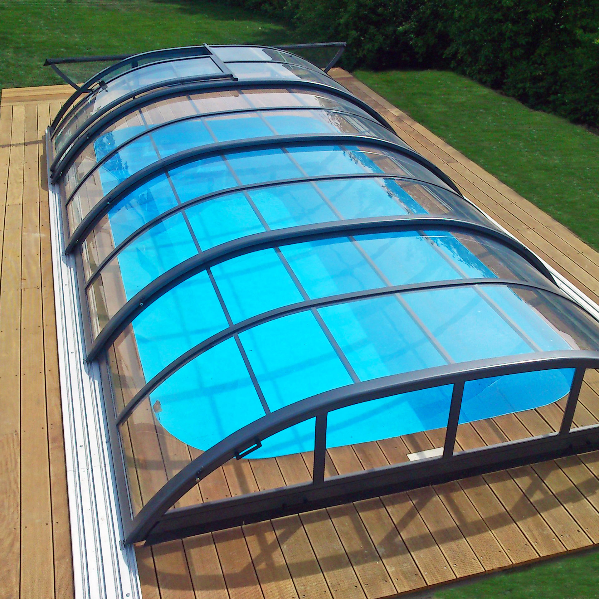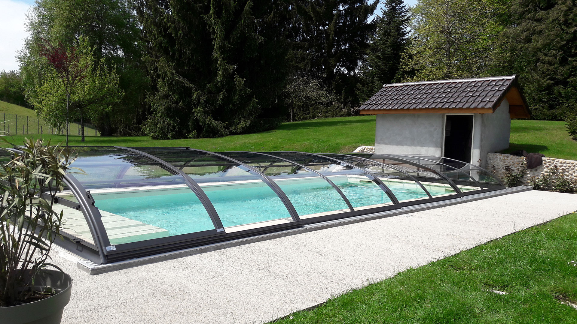Les abris bas Piscine Week-End sont caractérisés par une très faible hauteur et une courbure très douce des voûtes (disponibles aussi en abris plats sans courbure). Adaptés sur mesure à votre bassin, ils couvriront parfaitement votre piscine. Ils sont ainsi l’atout parfait pour votre extérieur en se fondant dans l’environnement de votre jardin.