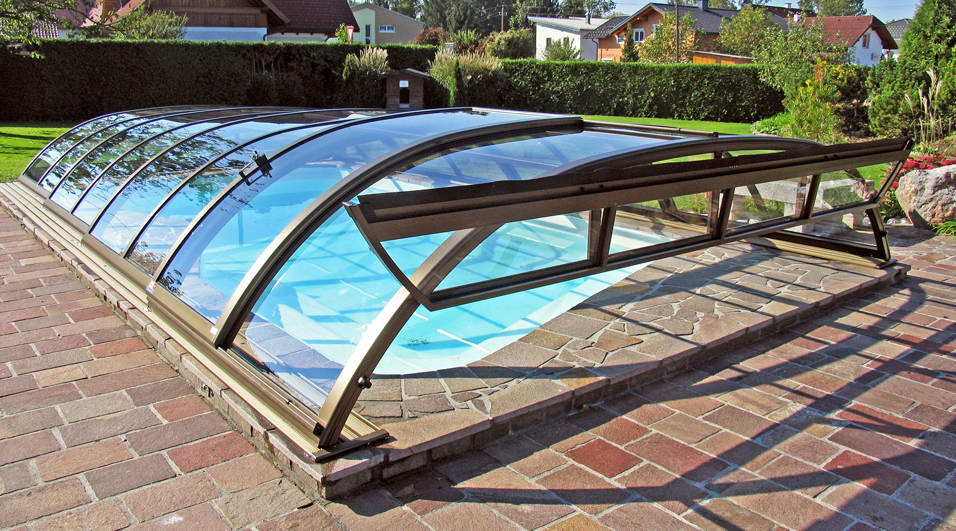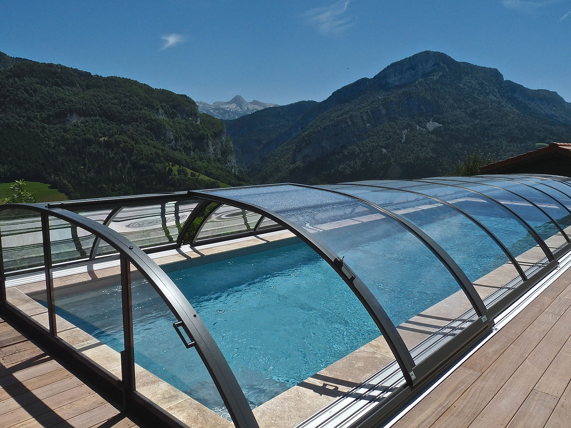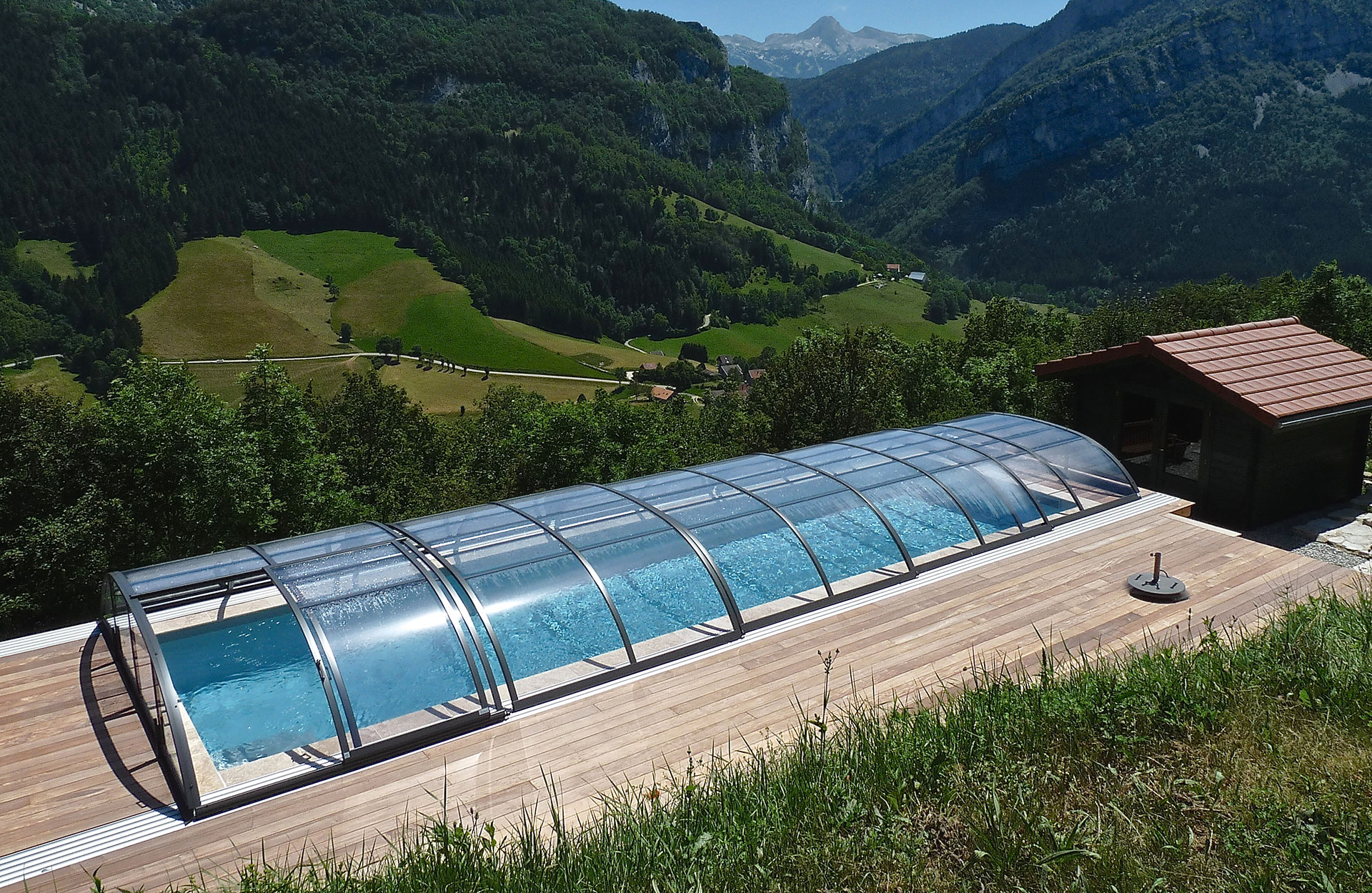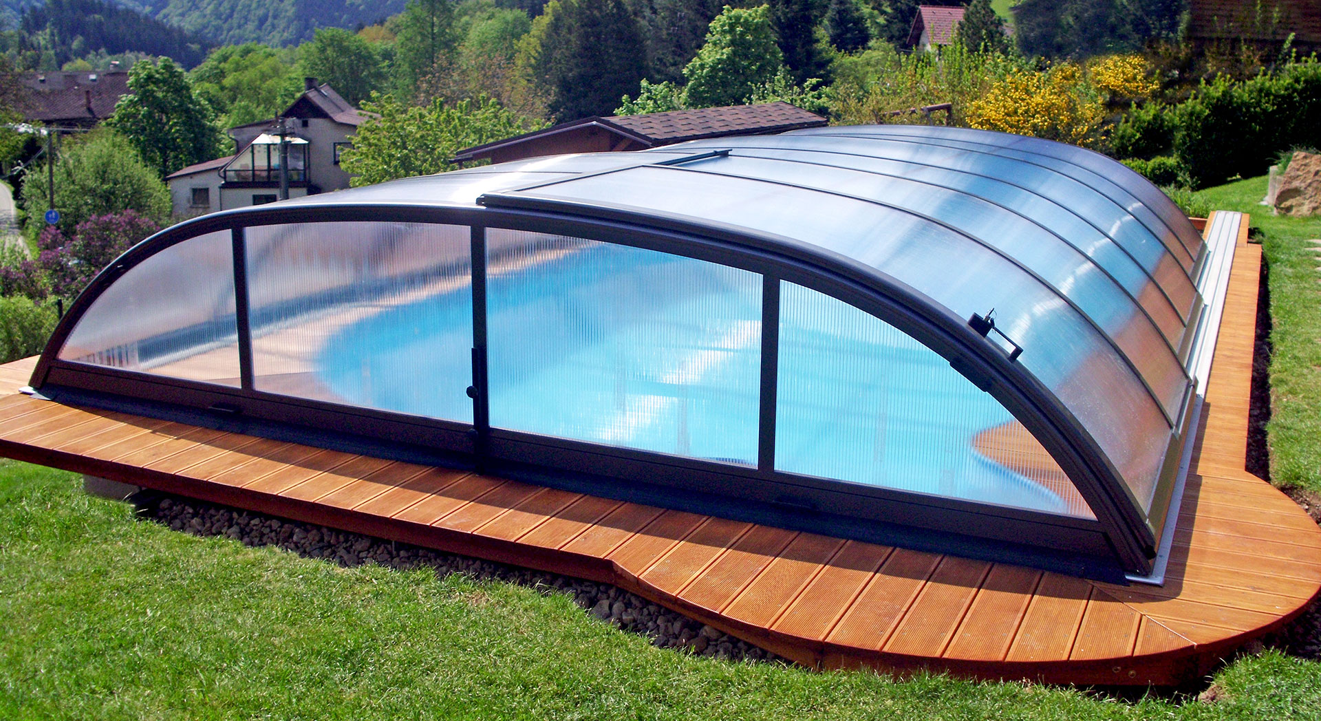 Les abris bas Piscine Week-End sont caractérisés par une très faible hauteur et une courbure très douce des voûtes (disponibles aussi en abris plats sans courbure). Adaptés sur mesure à votre bassin, ils couvriront parfaitement votre piscine. Ils sont ainsi l’atout parfait pour votre extérieur en se fondant dans l’environnement de votre jardin.